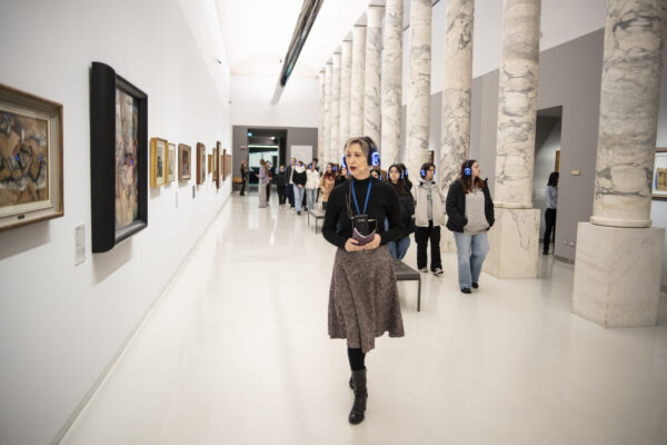 Un gruppo di studentesse e studenti ascolta in cuffia, di fronte alle opere d'arte esposte, Roberta Bosetti, nella performance itinerante al Museo del Novecento dal titolo Exhibition